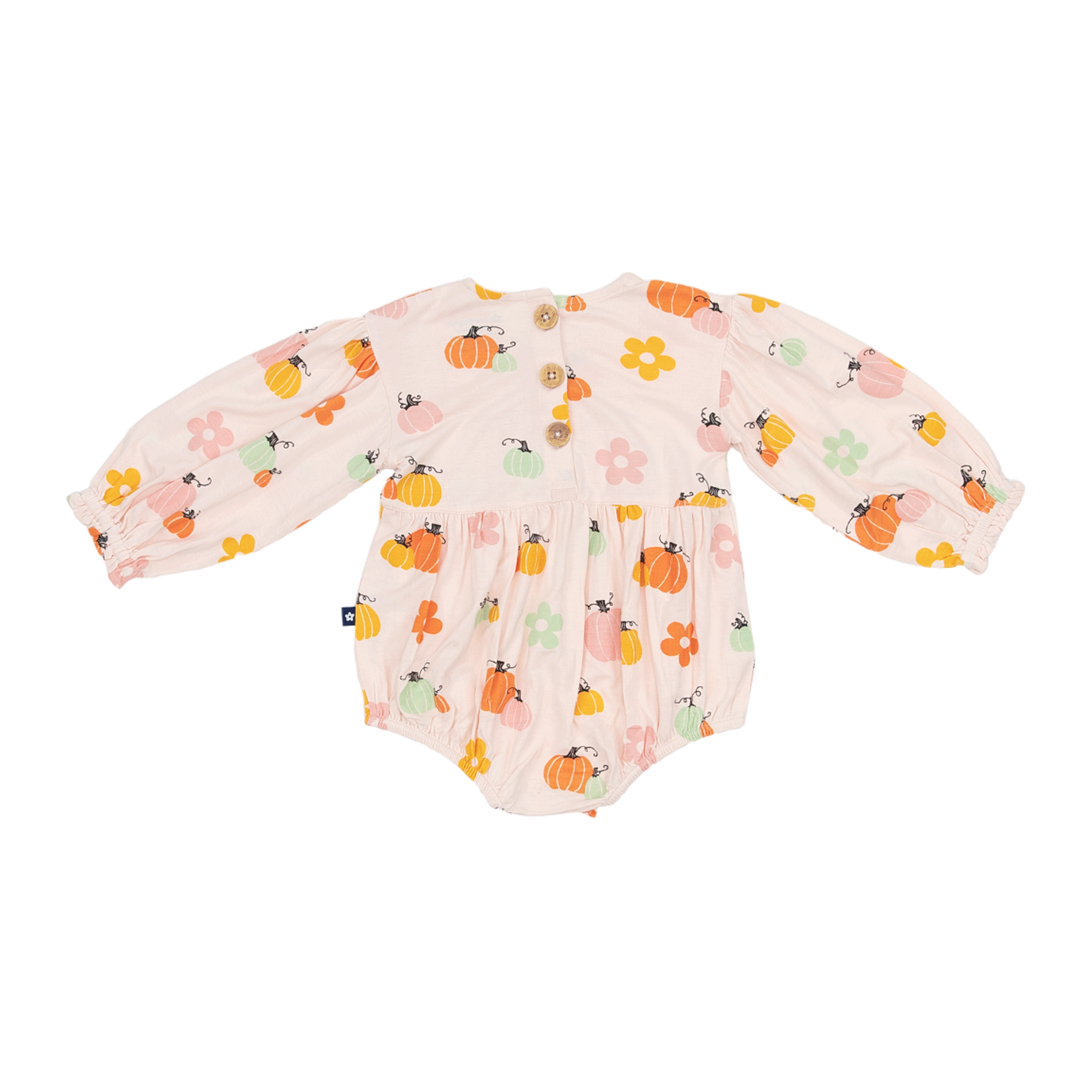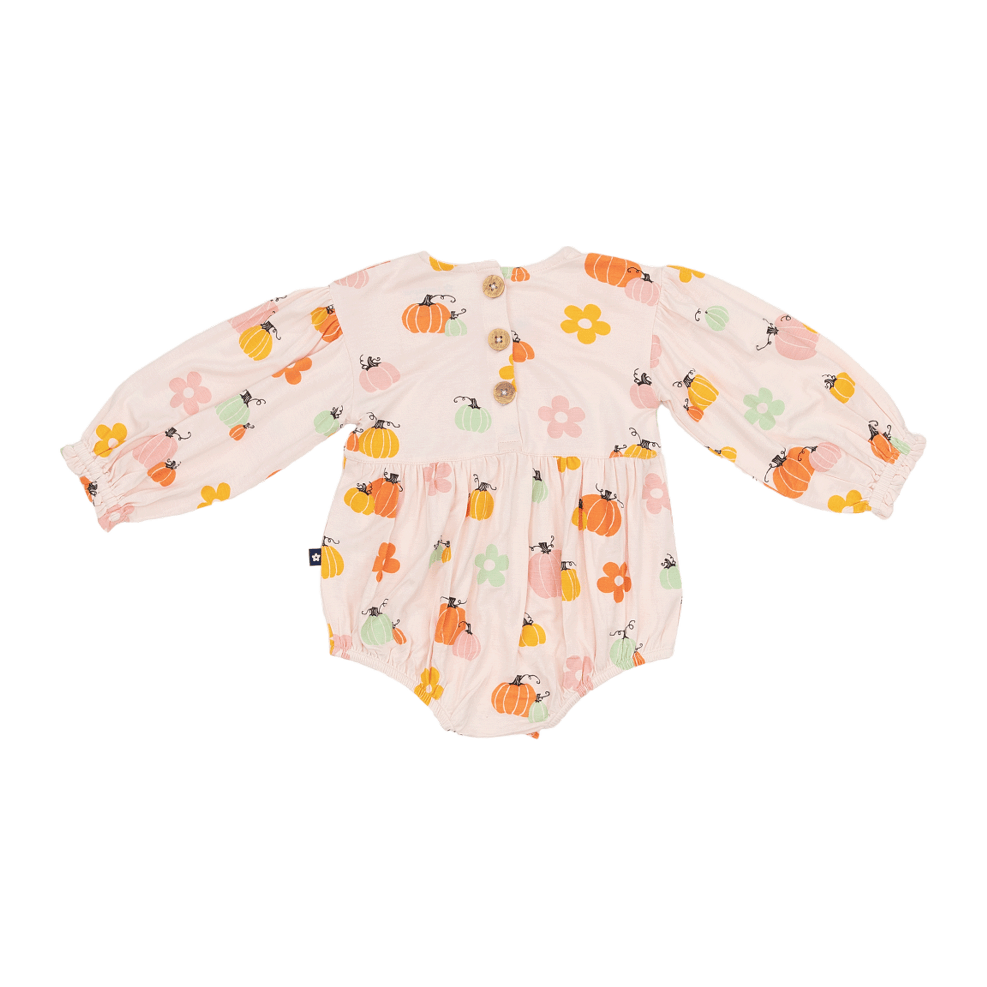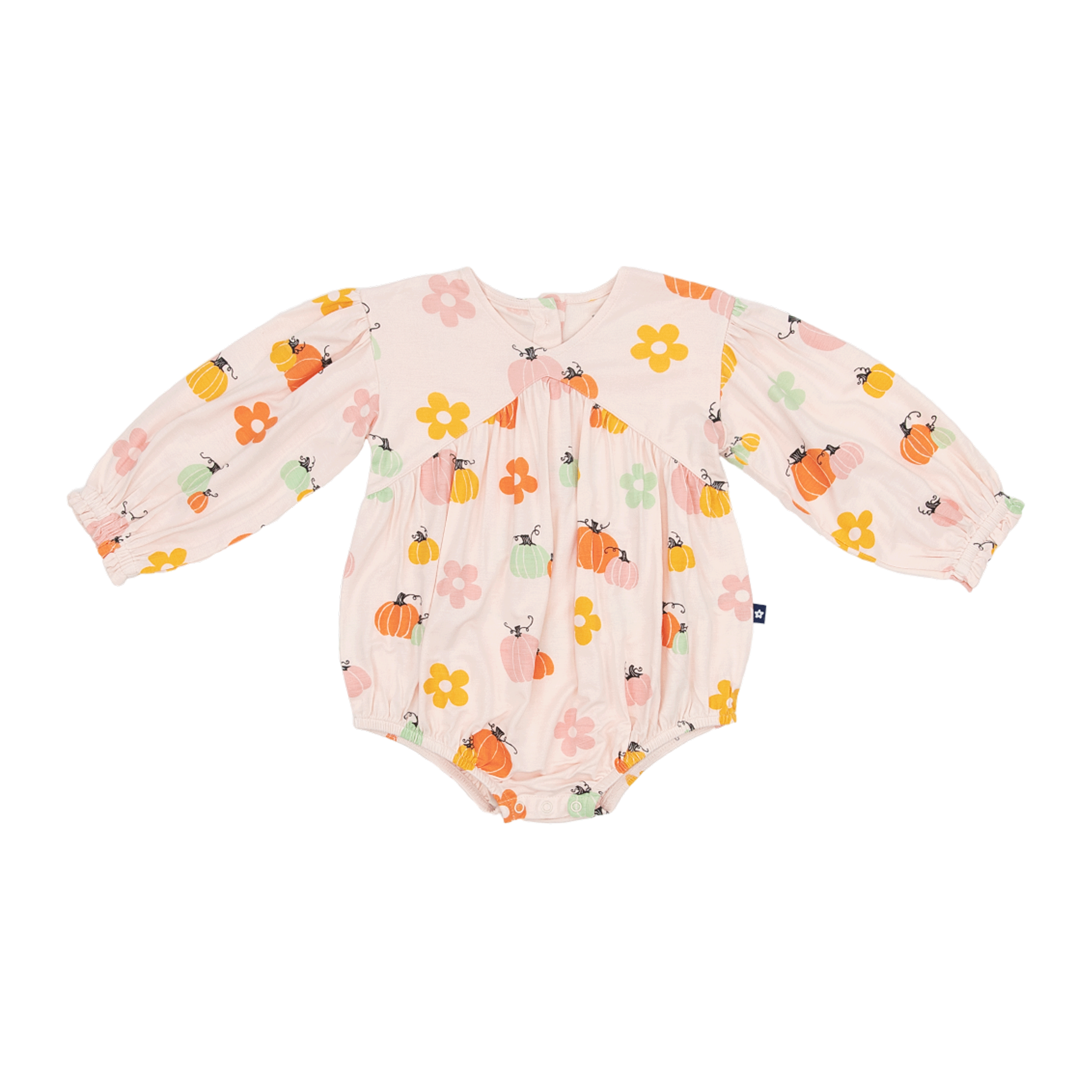 The relaxed, oversized fit gives it that charming bubble shape, while delicate ruffles add a sweet finishing touch. A back placket makes slipping it on a breeze, and three snaps along the diaper line mean quick changes without the fuss.