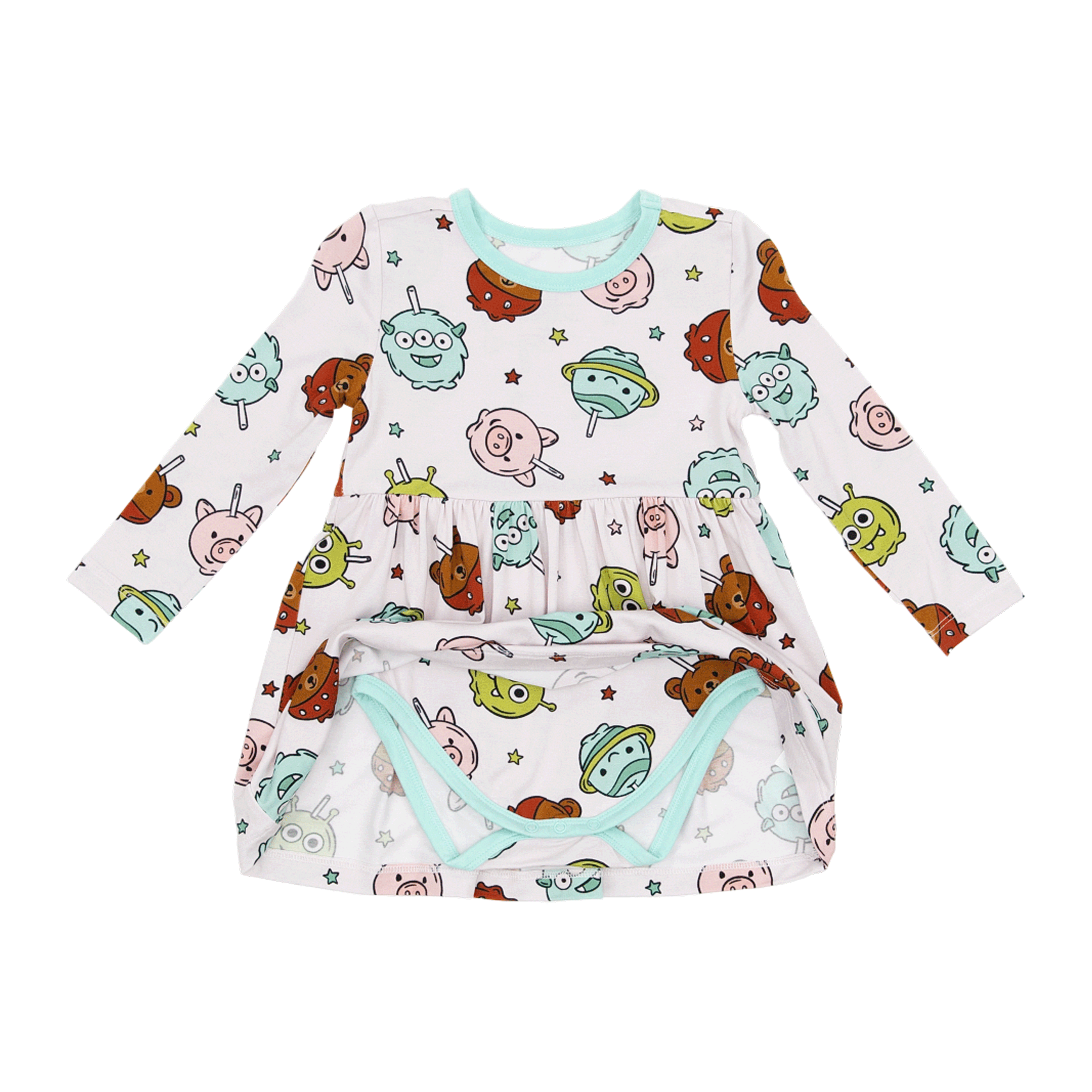 The flowy skirt adds beautiful movement for older sizes, while the built in bodysuit for smaller sizes makes diaper changes quick and fuss free. Every detail is designed for easy wearing, effortless movement, and everyday comfort.